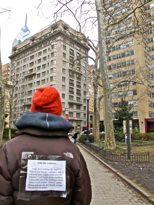“FOR THE CURIOUS…”  read the sign taped to the young woman’s jacket. “I am slow-walking the length of Rittenhouse Square, a distance that, at a normal pace, takes a little over two minutes.  I will begin at the southwest corner and end at the northeast corner, where I will resume “normal” speed. Please join me for any length of time should you so desire.”