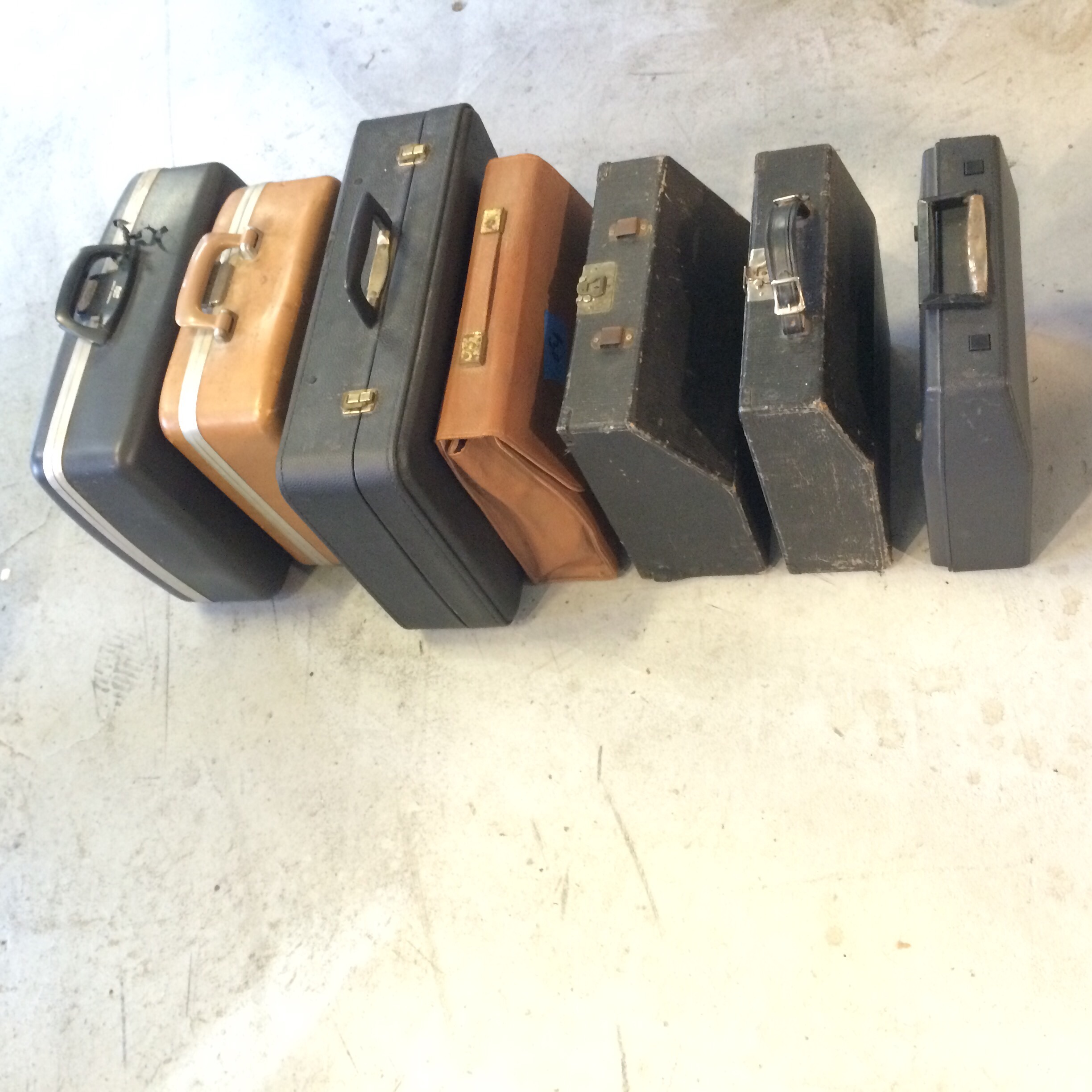l-r: Smith Corona Classic something-ish; Smith Corona Sterling-ish; no idea!; Olivetti-ish; Continental-ish; Remington Portable; Adler Tippa-ish.