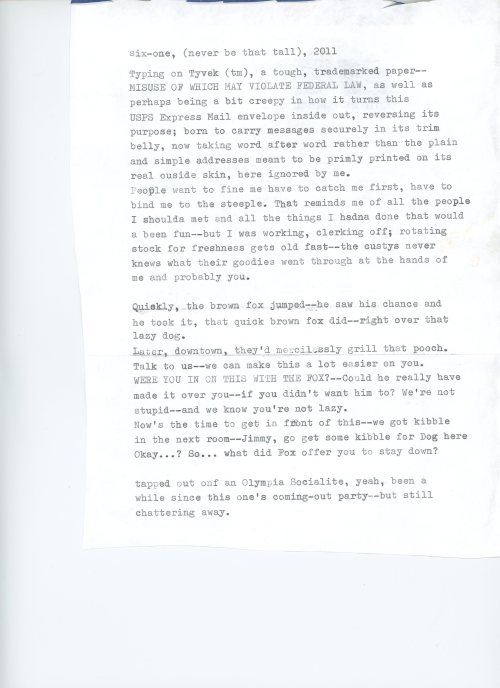 A portfolio stuffed with regular typing bond, nicer stationery, envelopes, stamps, and the Speed Typing document–up till now a carefully-kept secret (even from myself!) — it’s a selection from Ernst Kreuder’s novel, The Attic Pretenders — an escapist fable and the first book published in Germany after WWII.