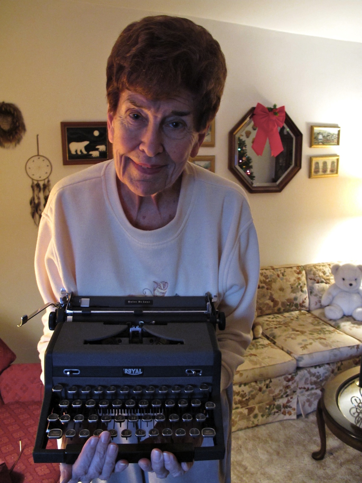 The Royal was a bit heavy and so she had a neighbor tote it upstairs. We talked about how her mom bought it for her and some of the things she used it for, and I promised I’d make sure it would go to someone who would take good care of it. I took some pictures of her holding the typewriter–I hurried because it looked heavy.