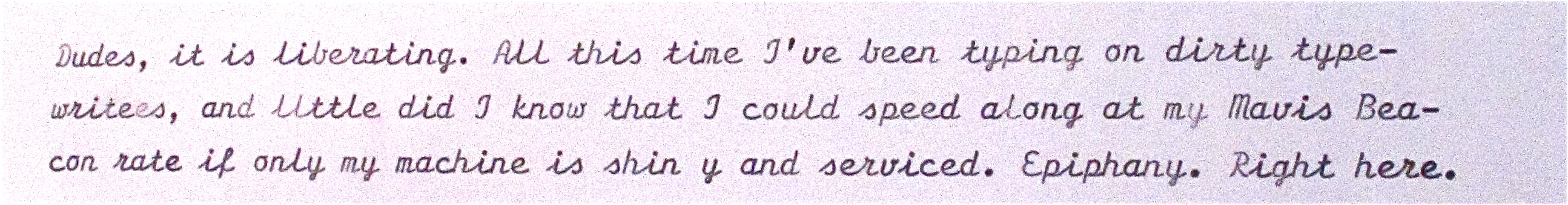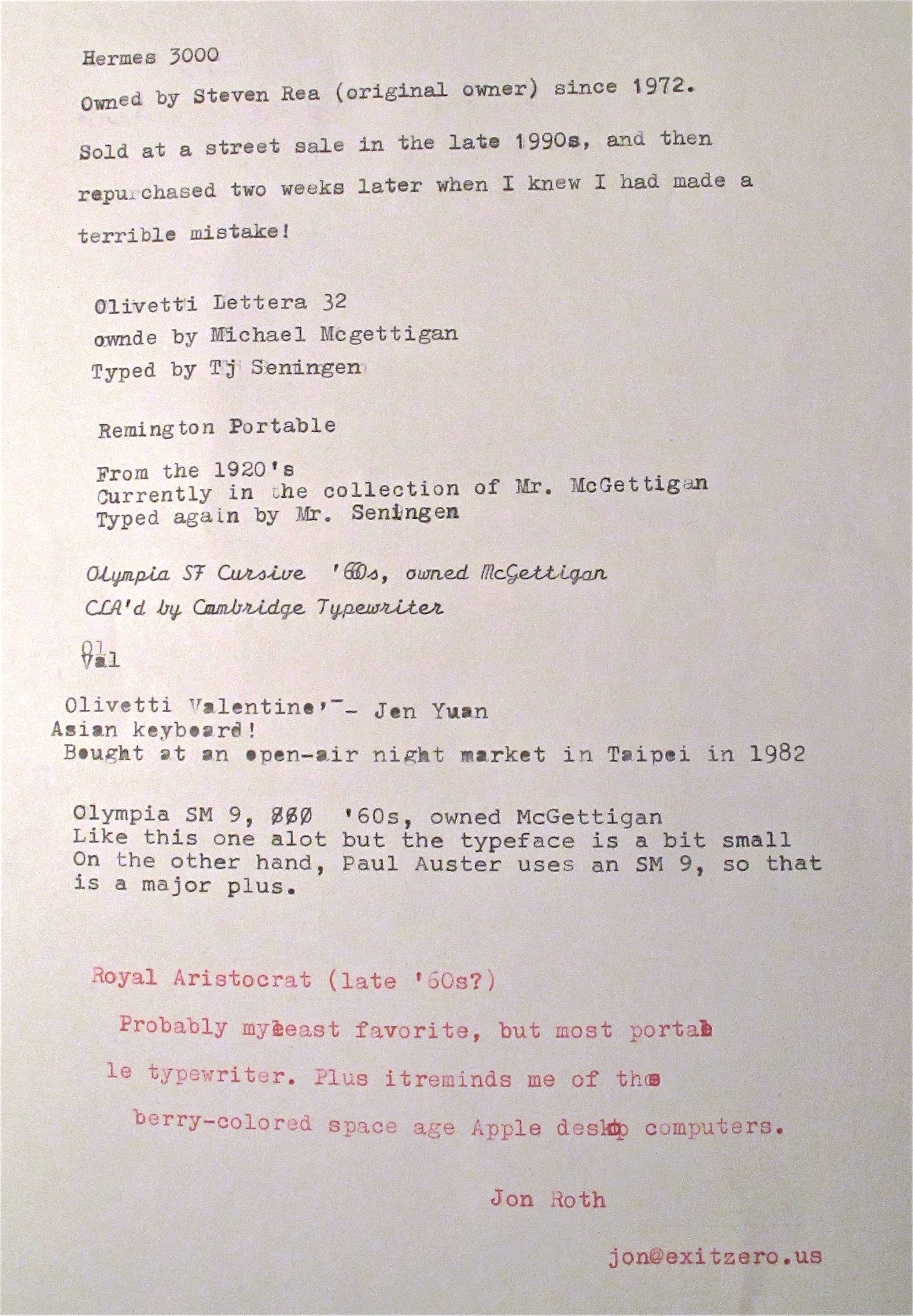 The small field precluded a Typing Competition, though we did see several letters completed. No one opted for a splash of Clinique’s budget “Happy” fragrance–so this mailing was totally scentsless! (sorry) Finally, we did perform a Typewriter Roller Call. This involves a sheet of paper starting in one typing machine, where its owner (or whoever is sitting in front of it at the time) types the make and model, their name and perhaps a sentence or two. (as shown here) Then the page goes from machine to machine, with each person typing a line or two, in that machine’s particular typeface… till the page is full.