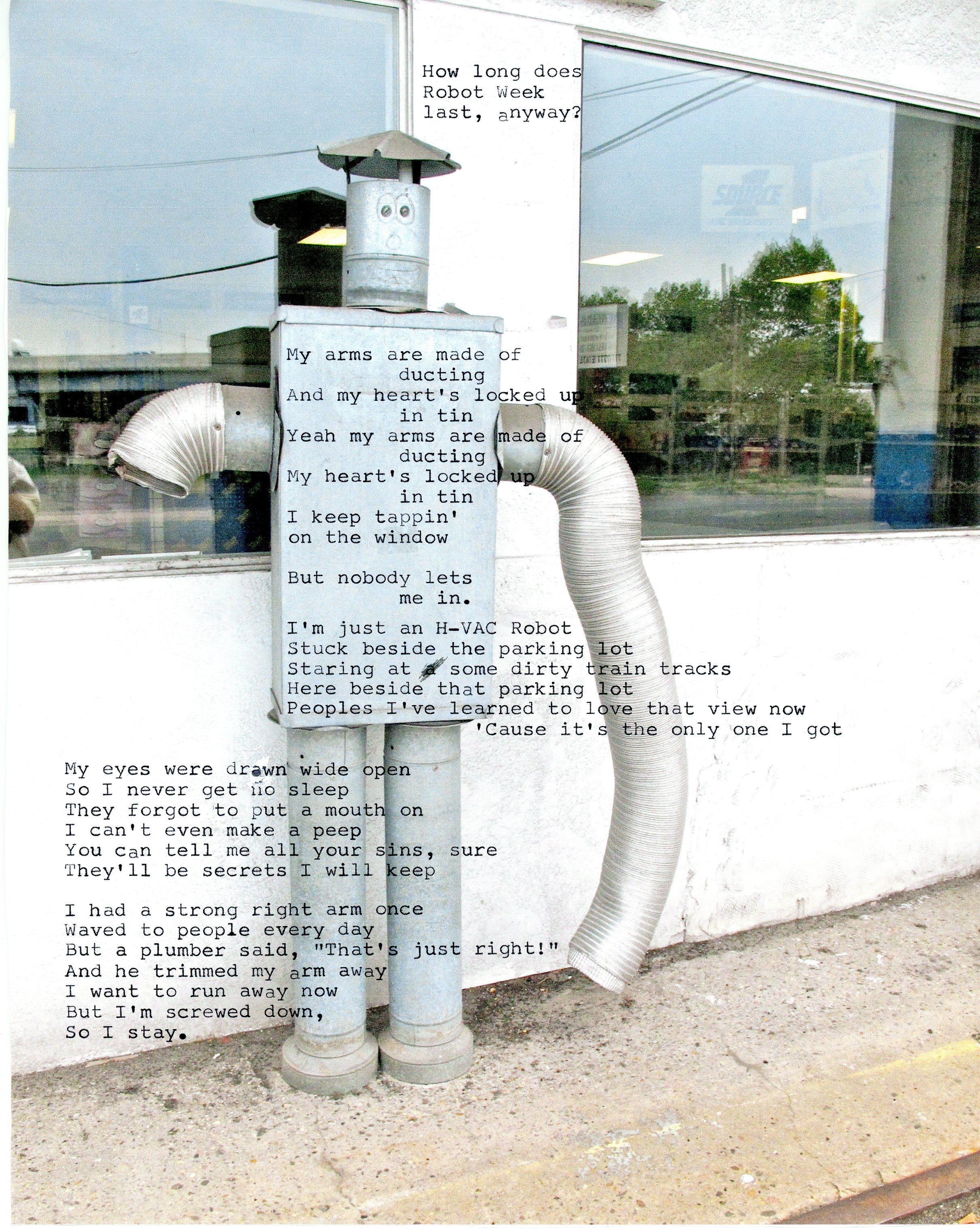 Along a busy road and train tracks, he stands, tall and eternally startled...