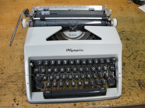OLIVETTI LETTERA 32 — This one was made in Barcelona… which alone has got me. My spouse and I spent all of 1992 in that beautiful city, teaching English and watching the Vespas zip past the Modernist buildings, and scrimping to buy some olives and champagne. Tom from Cambridge saved this typewriter from oblivion, replacing its mainspring and etc. Man those Italians, with that bit of dash, just saying, “I shall put the red key HERE. Now, it’s finished and we get some espresso.”